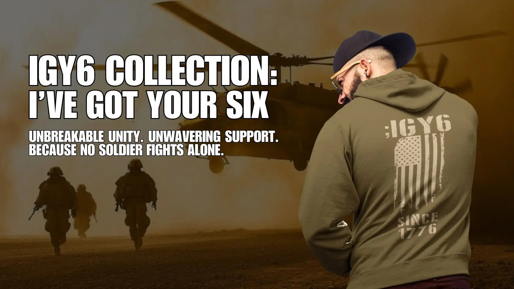Our IGY6 Collection includes patriotic apparel like hoodies and t-shirts, plus accessories that feature the “I Got Your 6” design or variations like iGy6 and I G Y 6. Every item is crafted for comfort, durability, and a bold statement of unity.