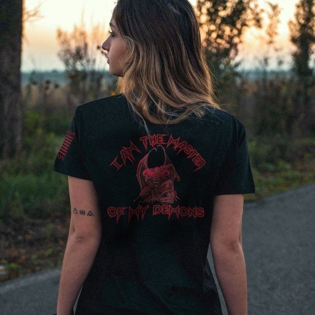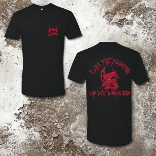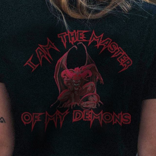 - Back Print: “I Am the Master of My Demons” with red demon artwork